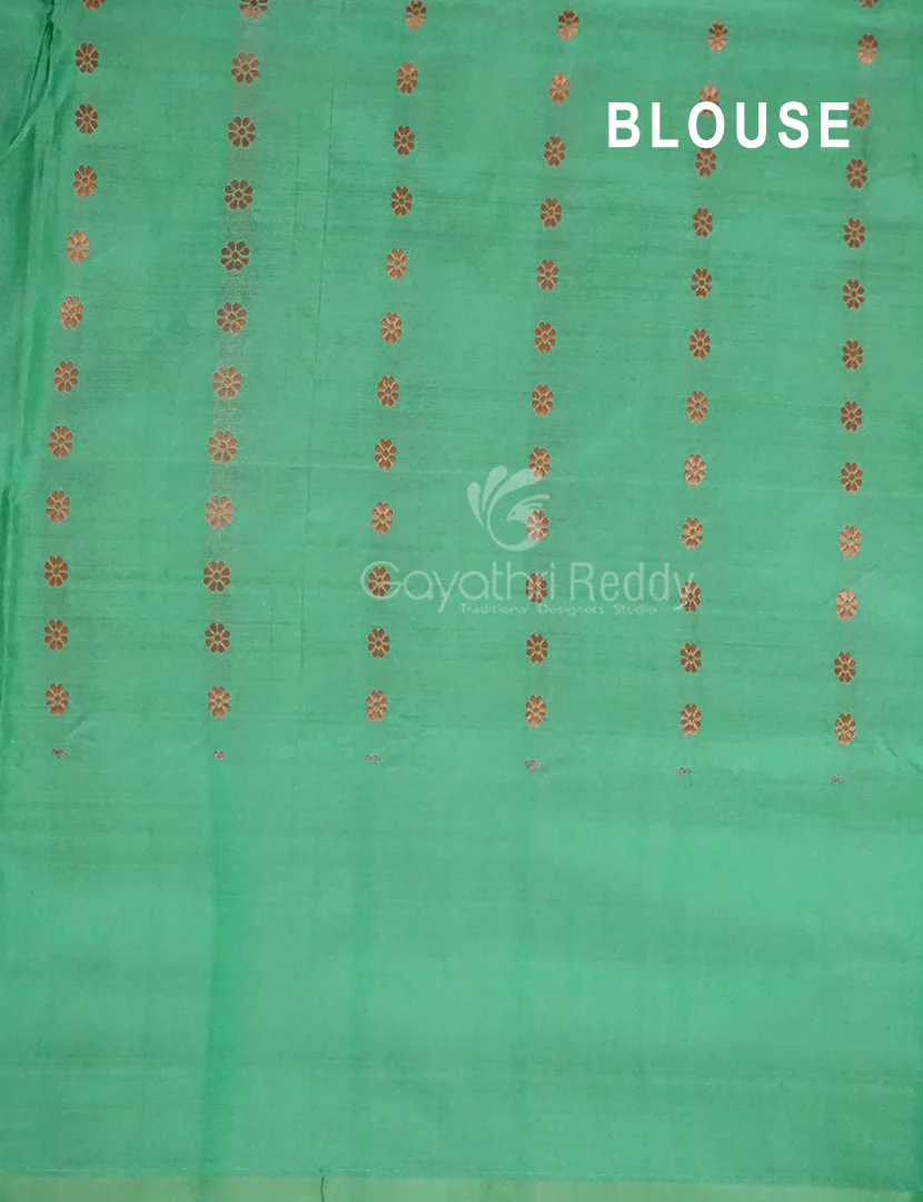 The rich fabric is adorned with exquisite zari buttes, meticulously handwoven to create a stunning pattern that shimmers with every movement. The borders of the saree are intricately designed with zari, adding a touch of grandeur to the ensemble.