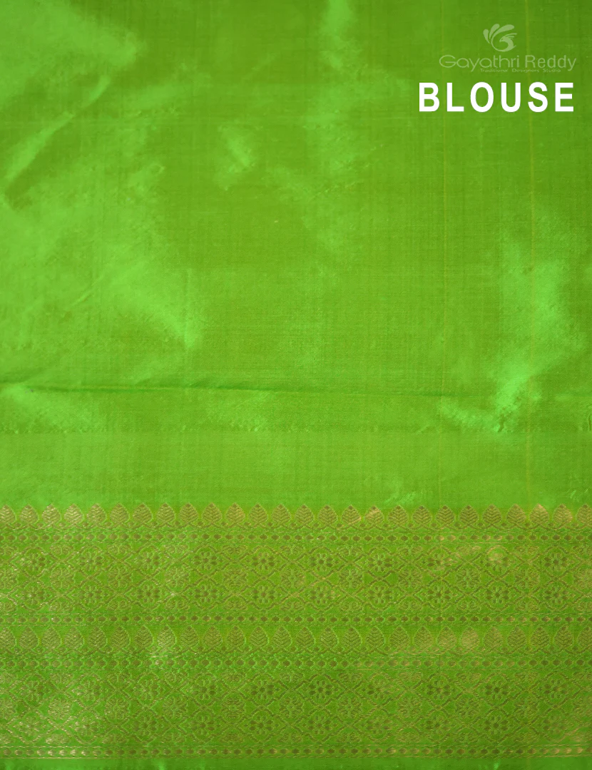 The shimmering zari buttes dance across the fabric, catching the light and every admiring gaze. Contrasting borders frame the saree with a bold yet graceful touch, perfectly paired with a matching blouse to complete the ensemble.